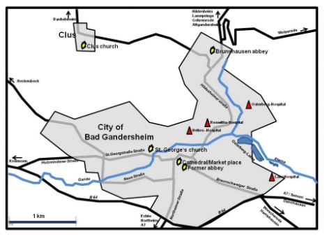 That could be the slogan of the bath town of Bad Gandersheim. Join us for a small walk through the town itself. We show you the highlights you should have see. The yellow and brown shown attractions are described in detail within following pages.