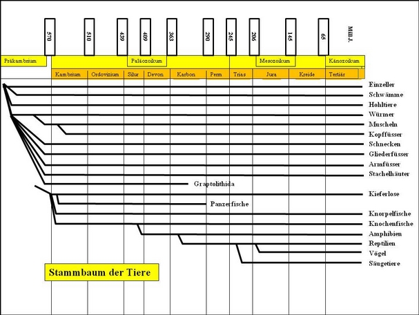 In geologischer Zeit kam es immer wieder zum Aussterben von großen Tiergruppen. Dies ist hier anhand der wichtigsten Tiergruppen dargestellt.