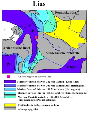 Die Überflutung beginnend noch im Rhät schritt europaweit im Lias kontinuierlich fort. Dies läßt sich anhand von Fossilien sehr gut nachweisen.