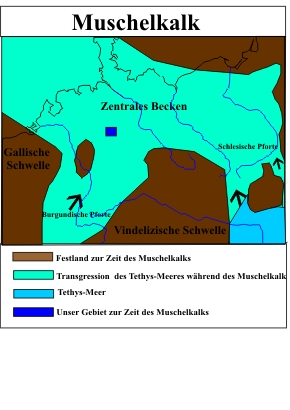 Im Oberen Muschelkalk öffnete sich eine neue Verbindung zur Tethys: die Burgundische Pforte. Neue marine Sedimente (Kalke) wurden im Germanischen Becken abgelagert.