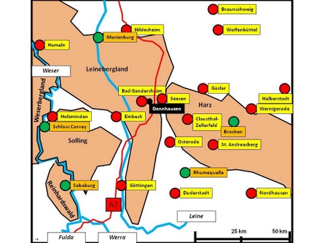 Einzigartig ist sich die Gipskarstlandschaft bei Osterode (20 km) mit ihrer besonderen Flora und davon abzuleiten auch die Rhumequelle (40 km) weiter südlich.