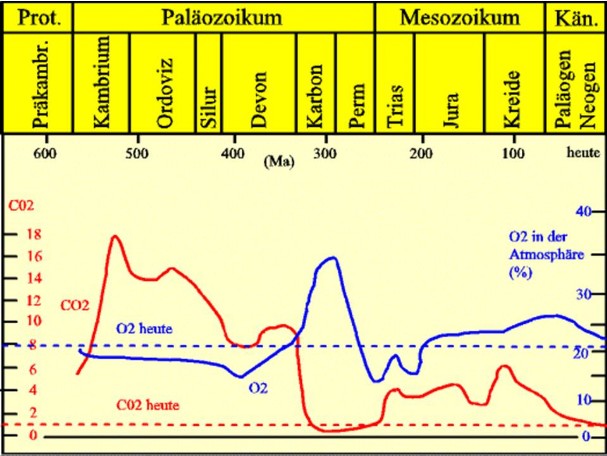 Der Kohlendioxidanteil der Atmosphäre zeigt eine deutliche Abhängigkeit zu der vulkanischen Entgasung mittelozeanischer Rücken. Er stieg zu Beginn des Phanerozoikums stark an, um dann mit dem Aufbau des Pangäa-Superkontinentes nach und nach wieder abzusinken. Die hohe Karbonbindung durch die ersten Wälder (im Karbon) ist auffallend. Im Jura und in der Kreide stieg der CO2- parallel zum O2-Gehalt wieder etwas an, um dann auf das heutige Niveau abzusinken.