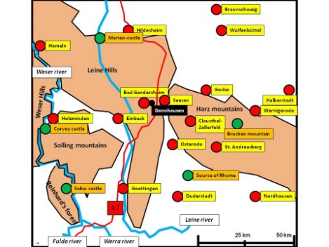 The central situation of Bad Gandersheim in the middle of Germany shows a lot of geografical highlights and different natural areas. Harz or the Solling mountains are worth a travel as also the Weser and Leine rivers withe their surrounding hills.