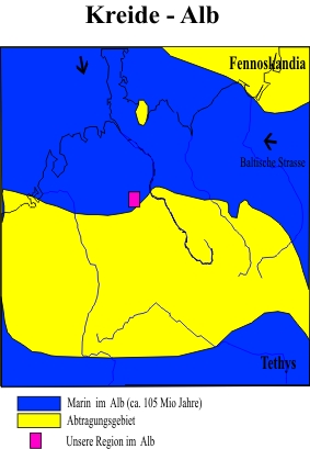 Bis zum Alb isst die Transgression weiter fortgeschritten. Unsere Region ist nun voll marin. Das Wasser kommt non Norden und über die neu geöffnete Baltische Strasse. Dunkle Schiefertone und kieselige Mergel sind die wesentlichen Ablagerungen.