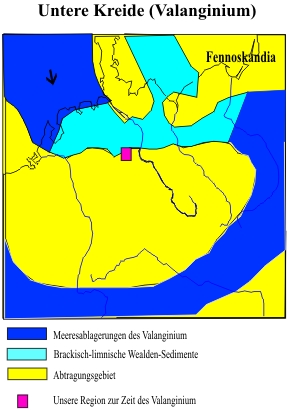 Unser Gebiet war zu Beginn der Kreide ein Flußdelta mit limnisch-brackischen Ablagerungen. Diese werden als Wealden-Formation bezeichnet. Zum Teil wurden in diesen Sedimenten so viele Pflanzen abgelagert, dass es zur Bildung von Kohleflözen kam. Im Laufe des Valanginium wurde dieses Flachgebiet zunehmend marin.