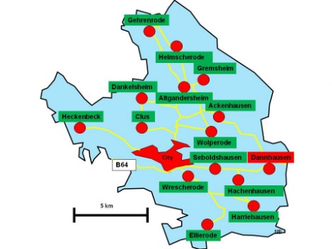 Auf der Karte erkennt man das Stadtgebiet von Bad Gandersheim mit Kernstadt und den Dörfern.